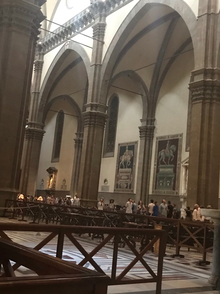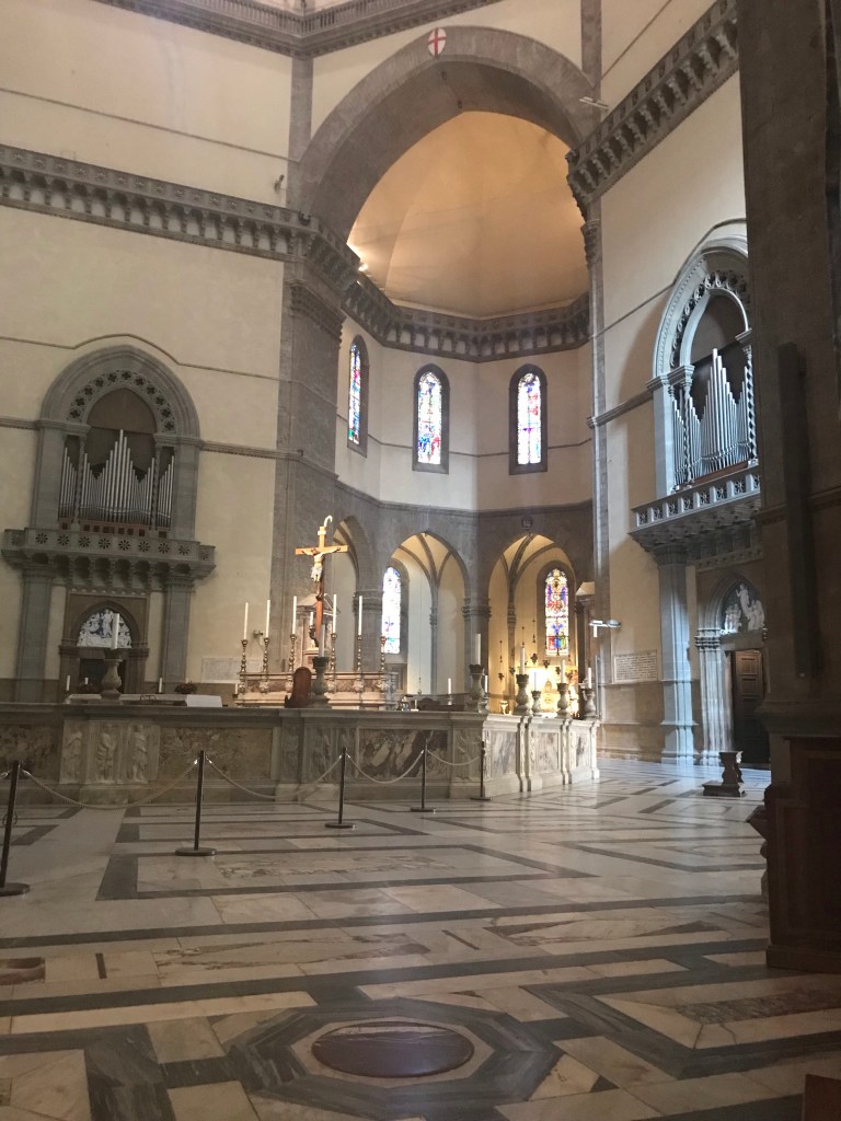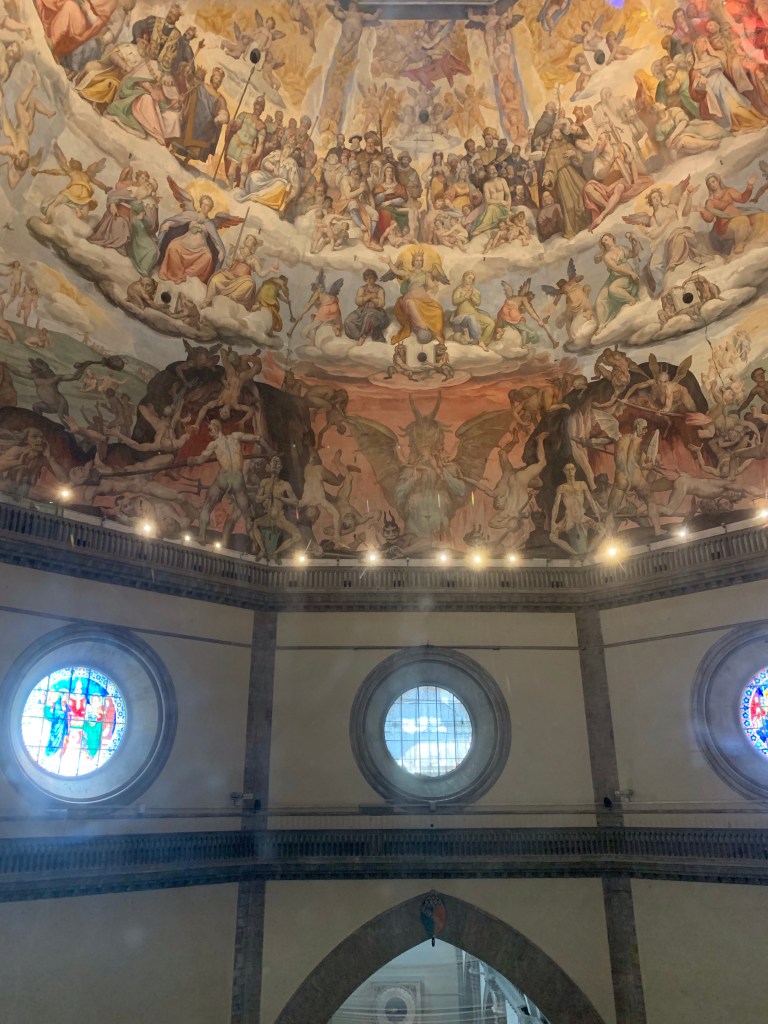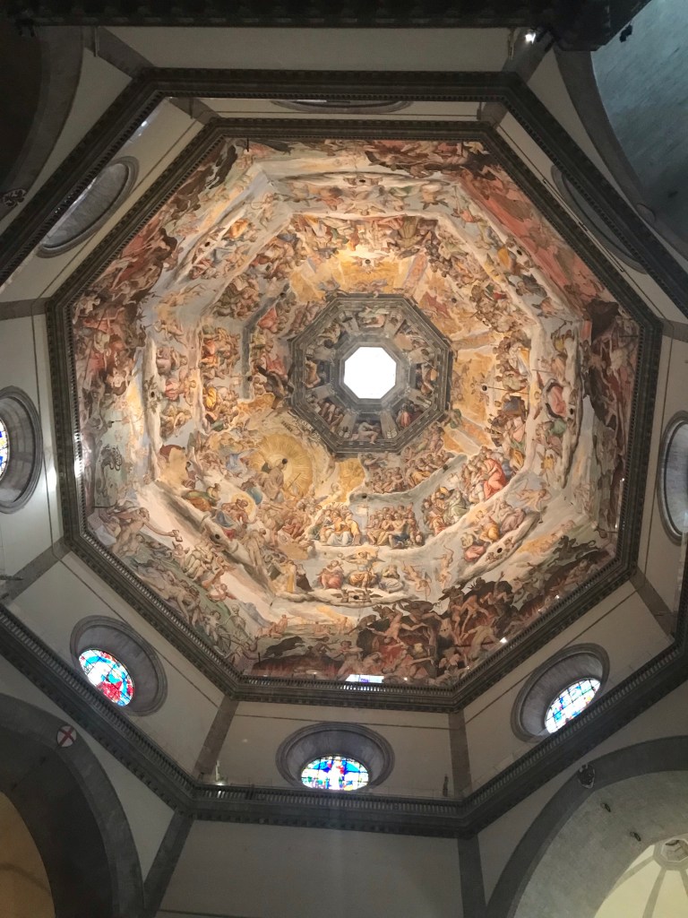 The Duomo, pictured above, is not as ornate on the inside as it is on the outside. There is a large clock on the inside door symbolizing your walk with Christ in your life ultimately ending with the beatific vision of Heaven. Christ crucified, resurrected and ascension to Heaven. There are terraces to climb that get you close to the top of the dome. The Church didn’t have the dome for many years because no one was sure how to construct it. The Cathedral was completed in 1436.