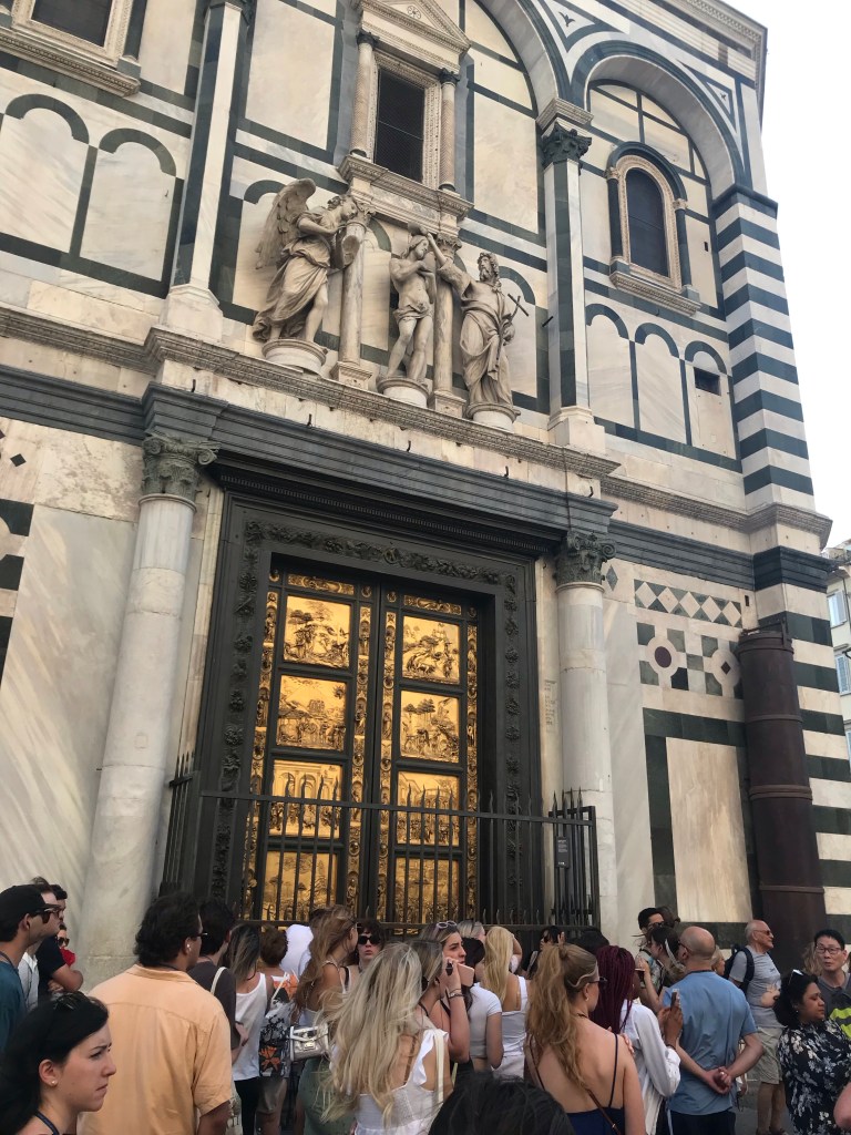 Our tour guide shows us the outside of the Baptistery and Cathedral before we go inside the Cathedral. The buildings are constructed of marble from nearby areas that are white, green, and red in color symbolizing faith, hope and love. The St. John Baptistery structure is a stand alone building and located in front of the Cathedral, as that is where the Christian life begins with baptism. The outside doors of the baptistery have golden panels on them with scenes from the Old Testament on one and the New Testament on the other. They took many years to complete. We will return another day to get a look inside with our tour ticket.