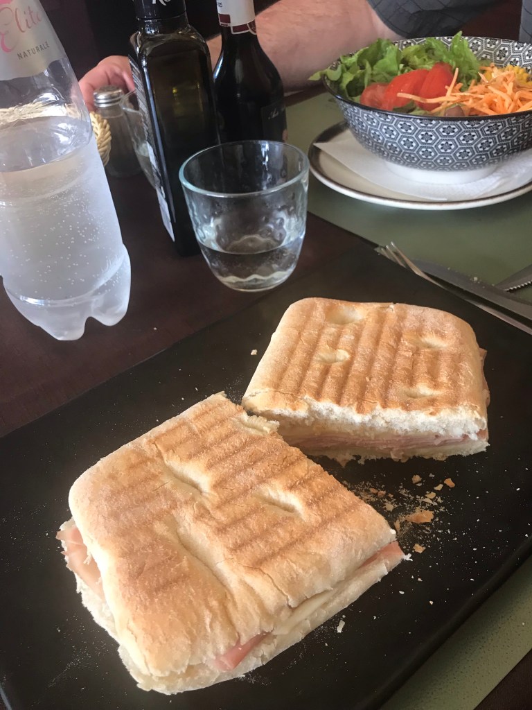 We stopped by a little cafe to have a snack before our tour begins. Paul got a mixed salad and I got a ham and cheese panini. Afterwards, Paul indulged in a pistachio gelato, with his goal to have one per day.
