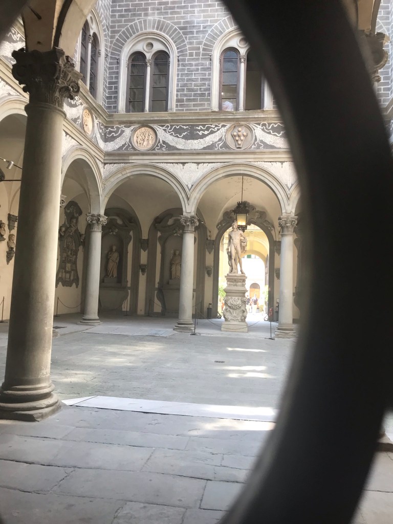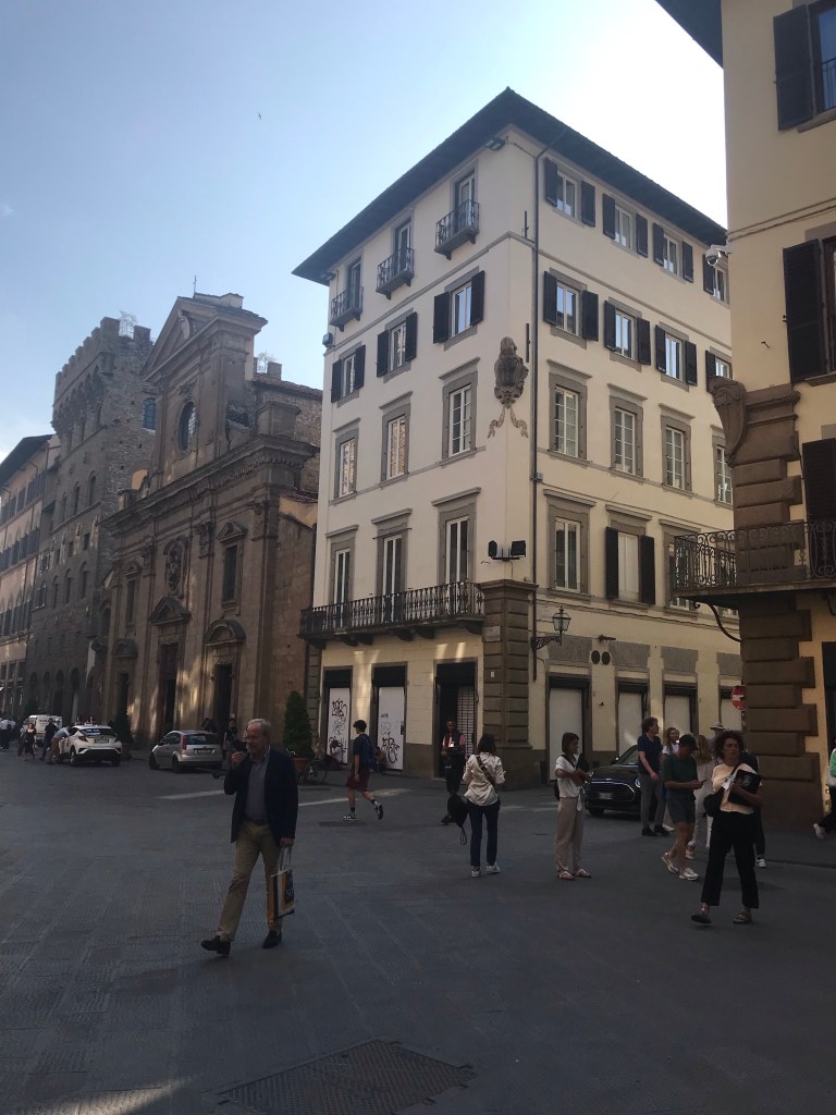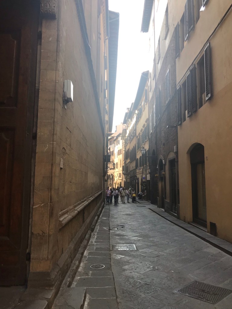 Our tour begins with a walking tour to the Duomo. Our tour guide points out one of the gated residential areas for the Medici family, a well known wealthy and political family of Florence, particularly in the renaissance period. The seven balls above the statue are their family crest or coat of arms and it shows up around the city in different places where they commissioned the work or financed the construction of a structure.